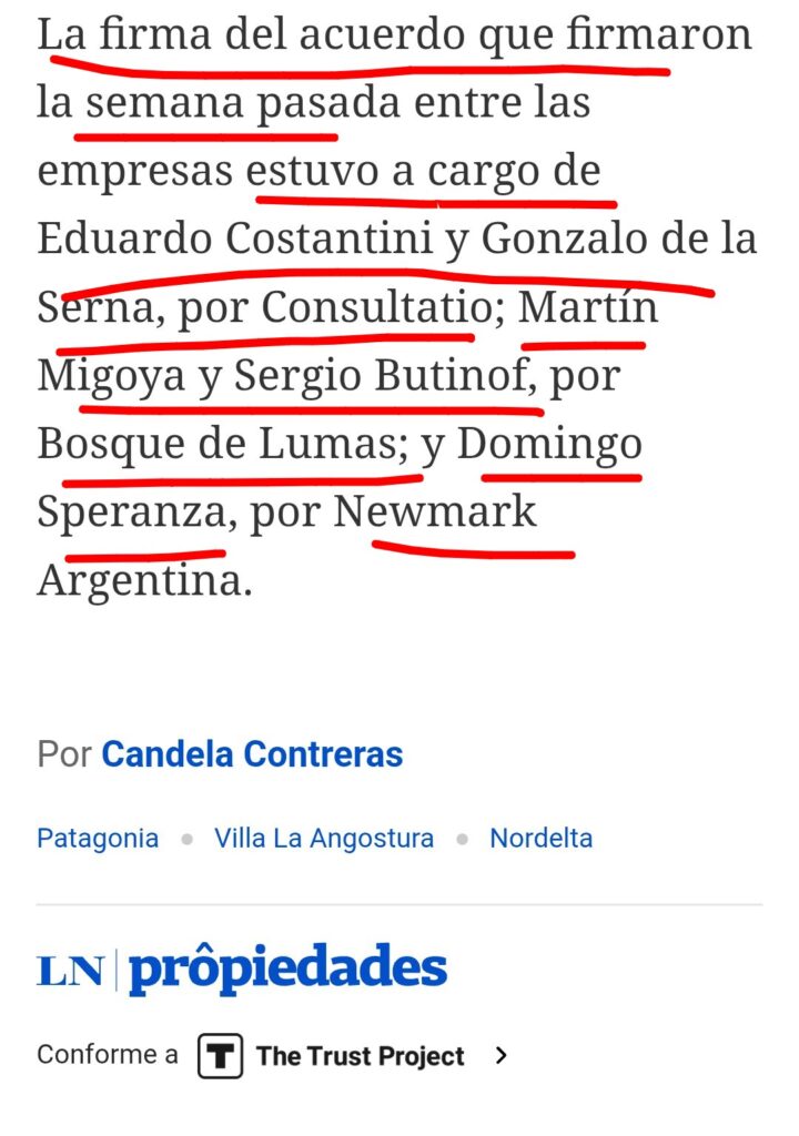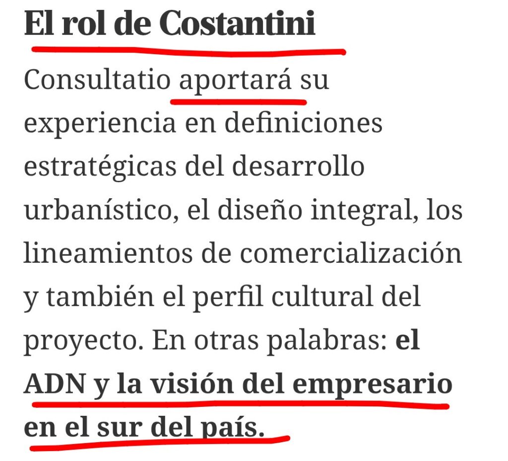 Continuamos, se hace referencia a la participación de Costantini, definiendo su «rol» en el emprendimiento Bosque de Lumas aportando «el ADN, la visión del empresario en el sur del país».