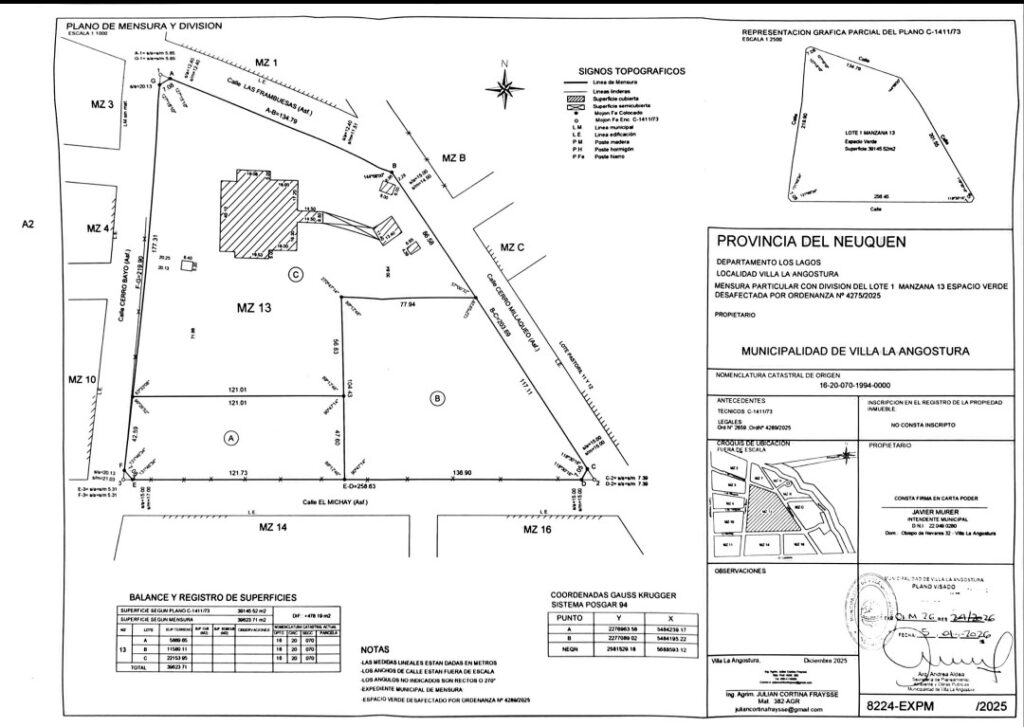 Este 5 de enero Catastro de Neuquén aprobó el plano de la manzana 13 con las diferentes subdivisiones (A, B y C, la última donde se ubica el Barbagelata, la escuela, la despensa cooperativa y la Dirección de Economía Social), realizado en diciembre 2025 por el Ingeniero Julián Fraysse.