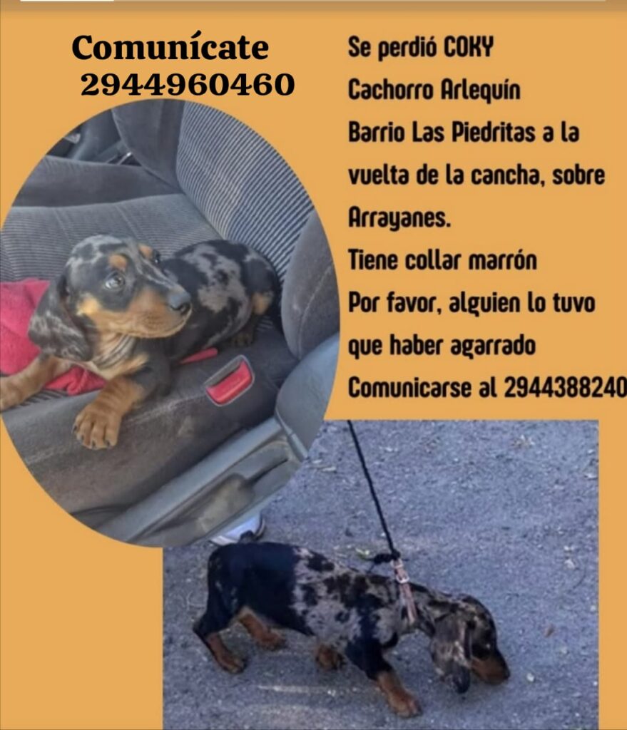 Este viernes 17 al mediodía en el barrio Piedritas se perdió Coky, un Arlequín de 3 meses que lleva collar marrón.